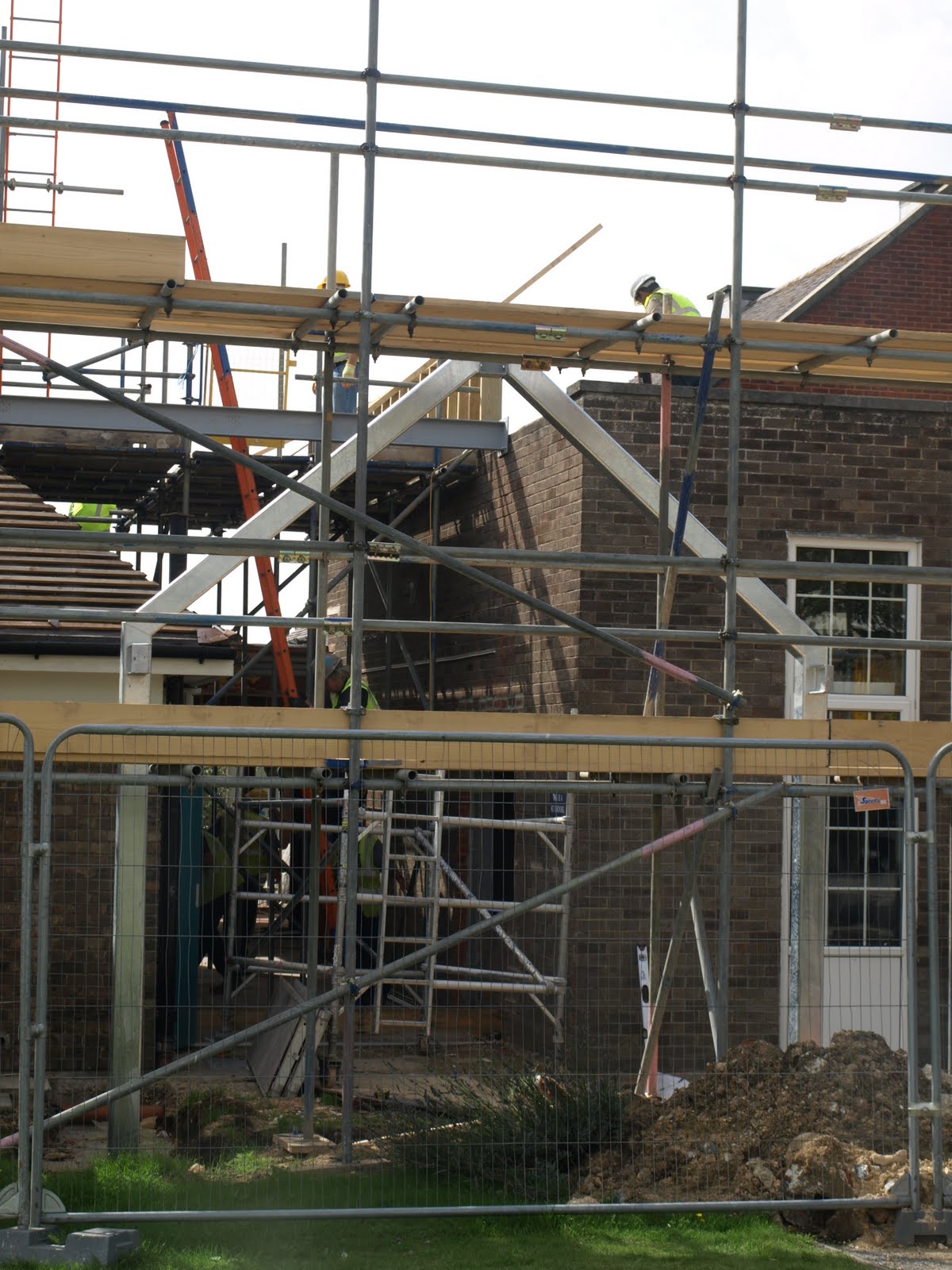 The scaffolding bars in the middle of this photo are roughly where the bridge will go - so that you can walk from the balcony to the Youth Pod.
